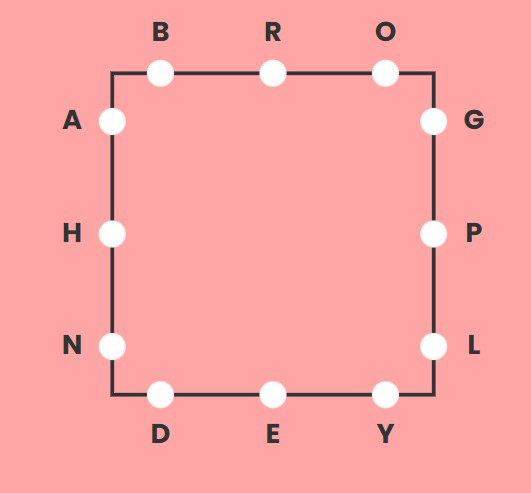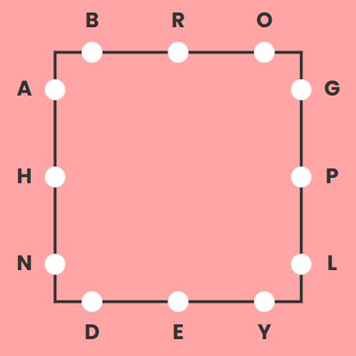 Words must be at least three letters long. Consecutive letters cannot come from the same side of the square, and each new word must start with the last letter of the previous word. All letters must be used at least once to complete the puzzle.